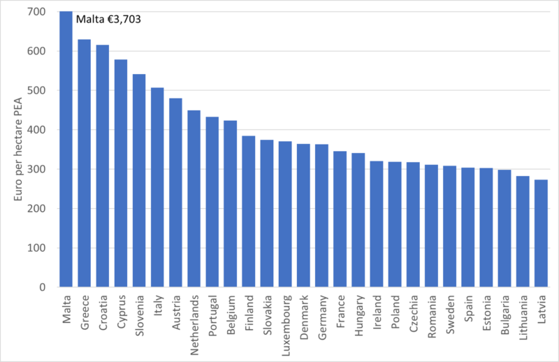 Based on PEA areas in column (1), the range for the ‘DABIS payment’ (that is, the sum of BISS, CRISS and CIS-YF) in 2027 will lie between €115 for Latvia to €261 for Cyprus (for this purpose I leave Malta aside because it is very much an outlier, as indicated in Figure 1). On this rather crude comparison, we can say that the Commission proposal to limit the range to €130 to €240 per hectare represents a narrowing.