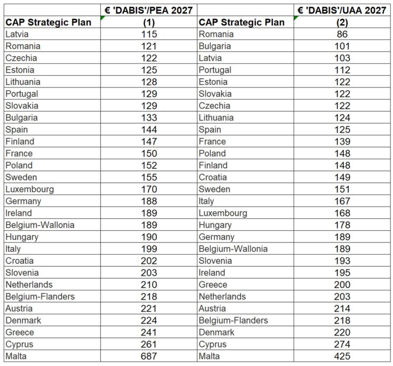 Notes: ‘DABIS’ payment in 2027 is defined as the sum of BISS, CRISS and CIS-YF payments. For Belgium, where there is little overall difference in PEA and UAA hectares, the PEA hectares for the two regions for which data are not available are assumed to be the UAA hectares for which there are data. I have chosen to use data for FY2027 which refers to claim year 2026 for direct payments as the source shows significant changes in payments in FY 2028 for a few countries as well as an overall increase in payments which I find hard to explain as it lies outside the 2021-2027 MFF programming period.